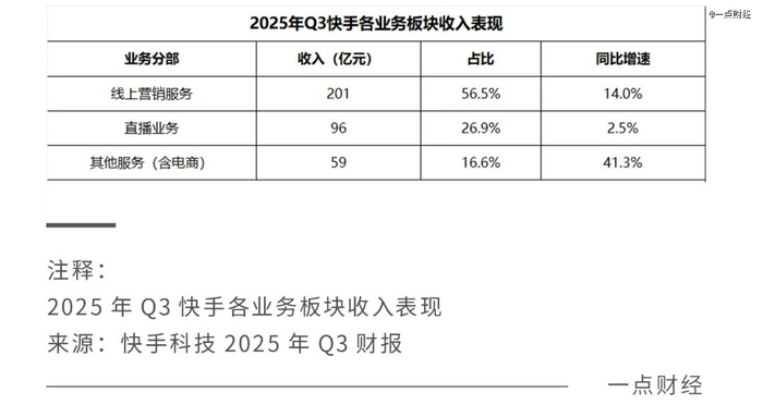 快手的营收主要来自三大块:线上营销、直播和其他(包含电商)。