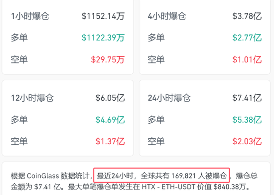 coinglass数据显示,过去的24小时内,加密货币全网合约爆仓超7.41亿美元,爆仓人数达16.98万人。其中,多单爆仓5.38亿美元,空单爆仓2.03亿美元。最大单笔爆仓单发生在HTX-ETH-USDT,价值840.38万美元。