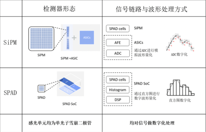 两者最终都可以输出数字信号(只是数字化处理模块的位置不同而已),都适用于激光雷达弱信号检测场景。