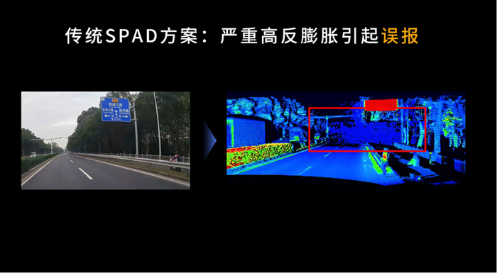 就比如传统SPAD名义上“数字化”了,但接收端数十个接收通道并行收光易引起“鬼影”、“高反膨胀”、“误滤除”等安全风险,这些情况都极易导致AEB误触发、误报、漏报等重大安全隐患,并且在雨天会更加严重。