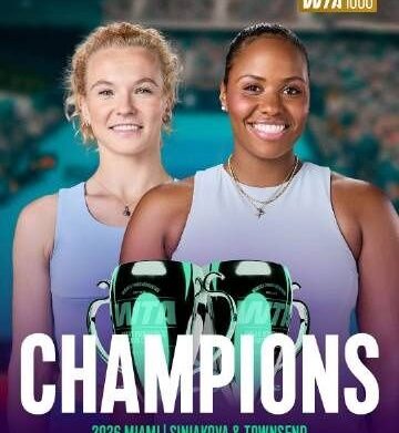 直播吧3月30日讯 WTA1000迈阿密站双打决赛,西尼亚科娃/汤森德背靠背夺冠,实现阳光双冠。