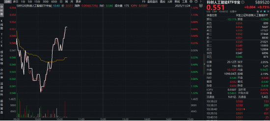 盘面上,今日(11月24日)重点布局国产AI产业链的科创人工智能ETF(589520)早盘“V型”反弹,场内价格现涨0.73%,场内频现溢价区间,或有资金进场抢筹!