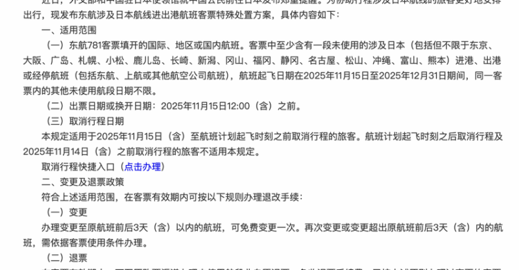 11月15日,国航、东航、南航三大国有航司率先公布了涉及日本航线客票的特殊处置方案,对于出行日期在12月31日之前且符合相关条件的客票,可予以免费退改处理。随后海航、深航、厦航、川航、春秋航空等十余家执飞中日航线的航空公司,也陆续发布了针对日本航线的特殊退改方案。