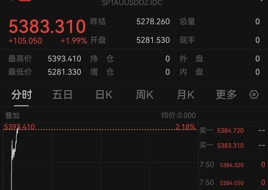 早盘,受美以对伊朗发动打击影响,现货黄金、白银直线拉升。截至发稿,现货黄金最高涨至5393.41美元/盎司,现货白银最高涨至96.39美元/盎司。