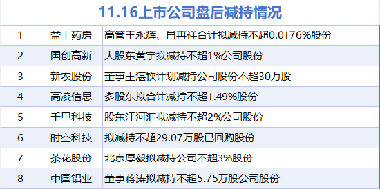 当日,包括益丰药房、国创高新、新农股份、千里科技、高凌信息、时空科技、茶花股份、中国铝业在内的8家A股上市公司披露了减持情况。
