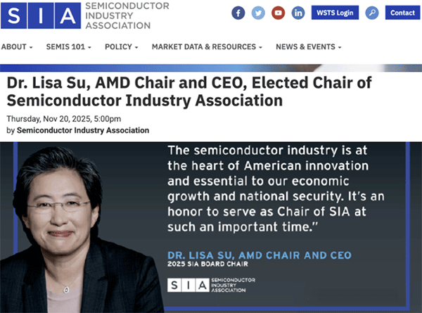 对于此次任命,苏姿丰表示:“半导体产业是美国创新的核心,对经济增长和国家安全至关重要,能在如此重要的时刻担任SIA主席,我深感荣幸。期待与SIA董事会同仁们并肩工作,共同致力于加强美国半导体的竞争力,拓展我们的创新基础,为未来打造一个更强大的芯片产业。”