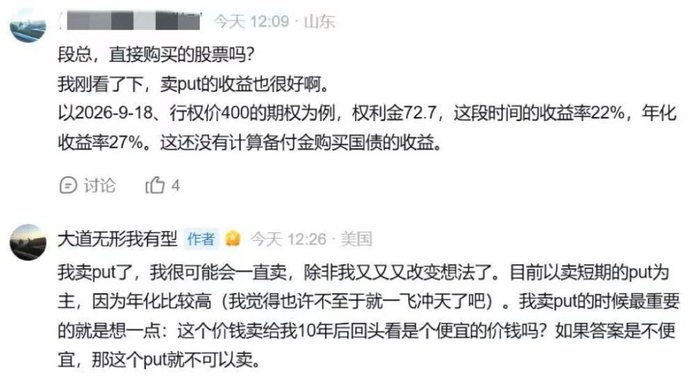 另有网友询问段永平是直接购买股票,还是卖Put。段永平表示:“我卖put了,我很可能会一直卖,除非我又又又改变想法了。目前以卖短期的put为主,因为年化比较高(我觉得也许不至于就一飞冲天了吧)。我卖put的时候最重要的就是想一点:这个价钱卖给我10年后回头看是个便宜的价钱吗?如果答案是不便宜,那这个put就不可以卖。”