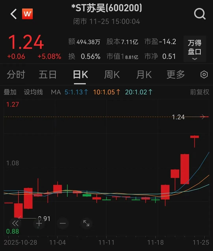 钱群山。图片来源:“江苏吴中”微信公众号值得一提的是,公告停牌前,*ST苏吴达成“五连板”。截至发稿,公司股价报1.24元,涨幅为5.08%,市值约为8.81亿元。