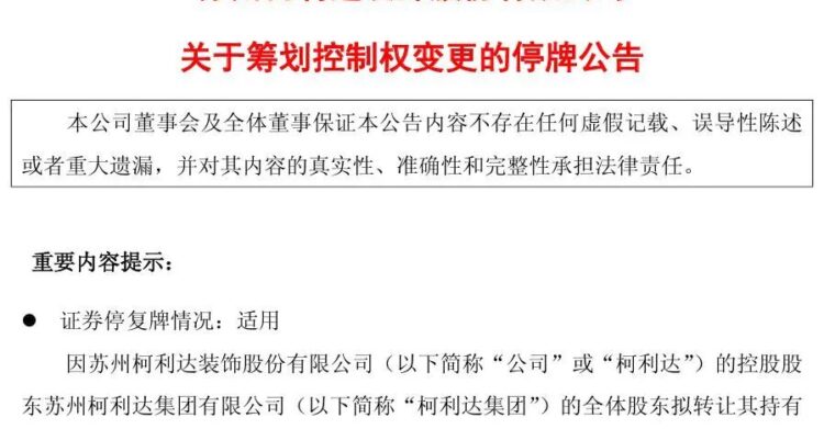 12月31日晚间,ST柯利达公告,当日收到公司控股股东苏州柯利达集团有限公司(简称“柯利达集团”)的通知,柯利达集团的全体股东拟转让其持有的柯利达集团100%股权。截至目前,柯利达集团直接持有公司无限售流通股1.12亿股,占公司总股本的18.74%。若转让完成,将导致公司控制权发生变更。