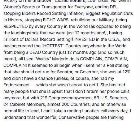 特朗普称:“我正撤回对众议员玛乔丽·泰勒·格林的支持和背书。”他补充说,格林正在竞选2026年连任,但她已经“走向极左”。