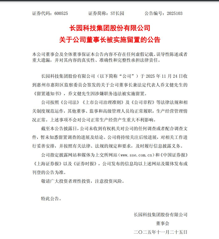 ST长园董事长,上任两个月即被留置!什么情况?